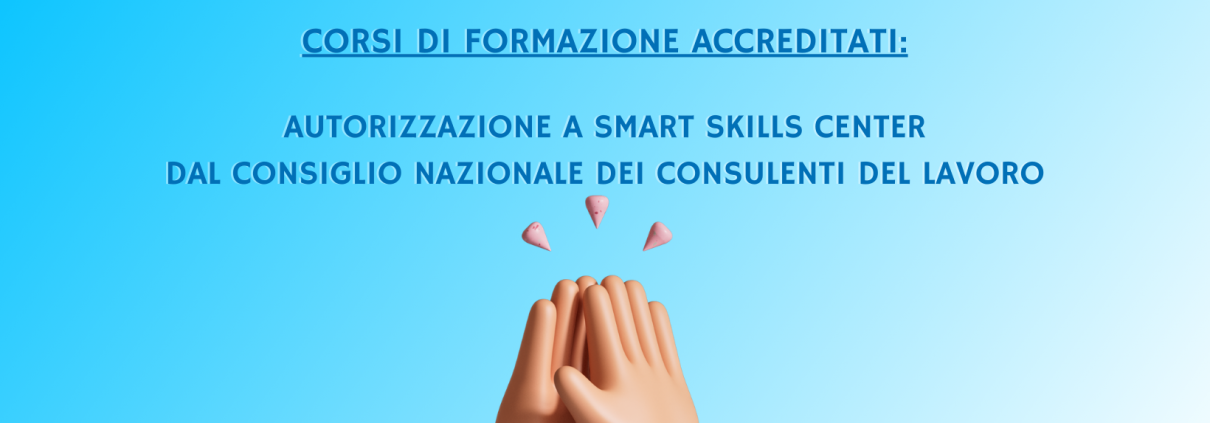 Smart Skills Center è stata autorizzata dal Consiglio Nazionale dei Consulenti del Lavoro per l‘organizzazione e lo svolgimento di corsi di formazione accreditati, in modalità e-learning e webinar, ai fini della Formazione Continua dei Consulenti del Lavoro.
