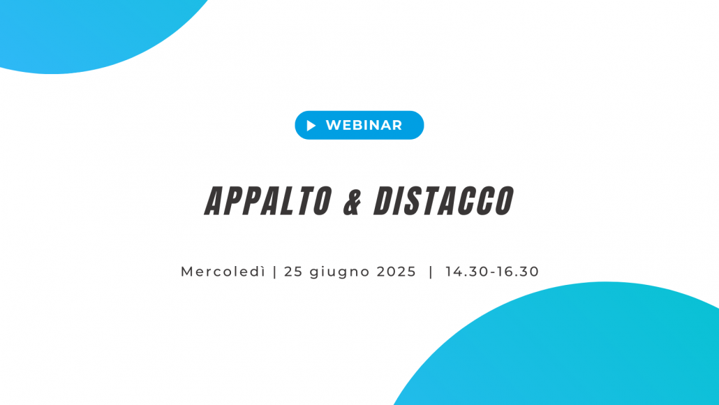 Ti invitiamo a partecipare al webinar: “Appalto & Distacco“, che si terrà mercoledì 25 giugno dalle ore 14.30 alle ore 16.30: il webinar è gratuito e si terrà sulla nostra piattaforma Smart360.